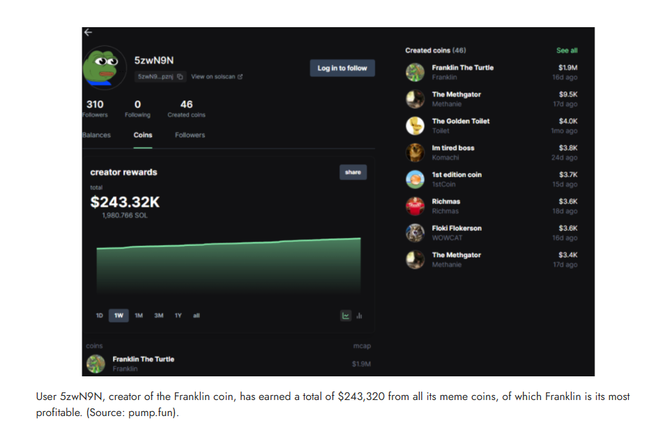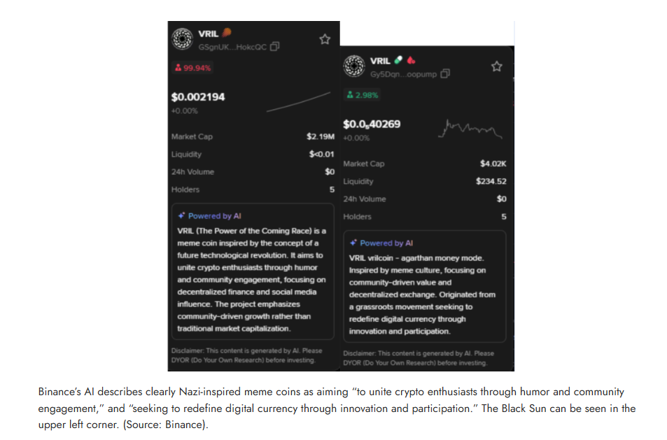 A new investigation into these extremist meme coins by the Global Project Against Hate and Extremism (GPAHE) has uncovered a multi-million dollar extremism economy on cryptocurrency marketplaces such as Binance, which boasts $65 billion in average daily volume (i.e., total value of coins traded in one day), and 300 billion spot transactions (i.e., a purchase or sale of a currency with instantaneous delivery) in 2022. It’s AI summary feature inexplicably promotes neo-Nazi coins as “innovation,” as Binance earns money on trades involving them by taking a 0.1% fee on every spot trade. Meanwhile, users can generate income from extremist ideologies through meme coin websites such as pump.fun, which offers revenue sharing rewards for content creators, equating to $500 paid in Solana (a cryptocurrency) for $1 million in trading volume, $2,500 for $5 million, and $10,000 for $20 million.