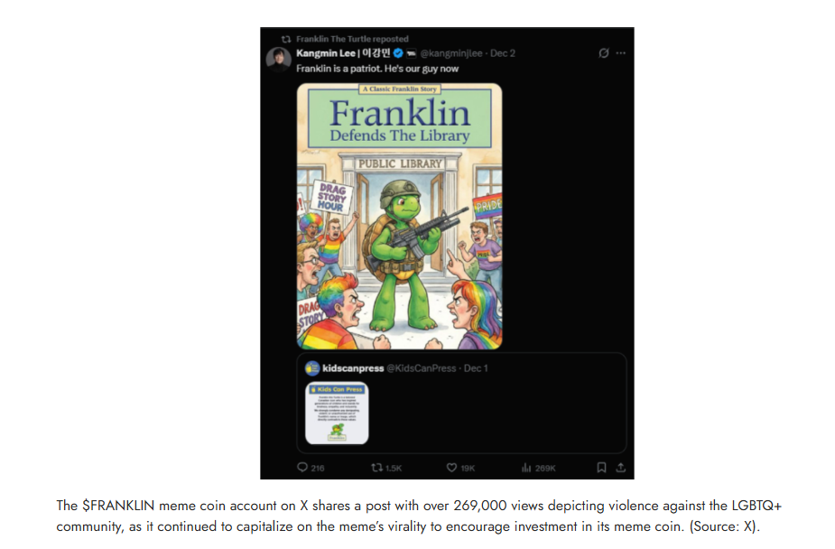 Cryptocurrencies (“crypto”), a series of largely unregulated online digital currencies, such as Bitcoin, Ethereum, and Solana, among many others, have a global market cap of over four trillion dollars. Crypto is commonly traded on marketplaces such as Binance, Crypto.com, Kraken, and others. “Meme coins,” which are cryptocurrencies produced as “jokes,” are part of this ecosystem, with its creators able to make millions by capitalizing on social media trends. Oftentimes, meme coin creators will buy the coin (or “token”) right after it launches, and sell after it gains traction, while others reap the rewards of revenue sharing systems. Hate runs through crypto culture, and especially in meme coins. Crypto was born from the finance and tech industries, whose male-dominated nature has been correlated with “rampant bigotry.”