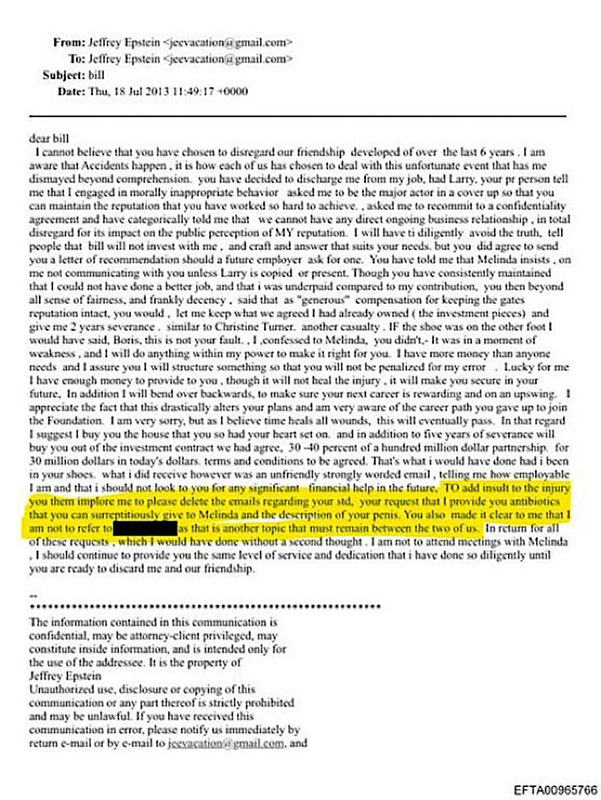 Sure, Bill Gates is going to say: "Pssst...hey Epstein...I think I might have given Melinda "the clap", got any antibiotics I can slip her in secret?"