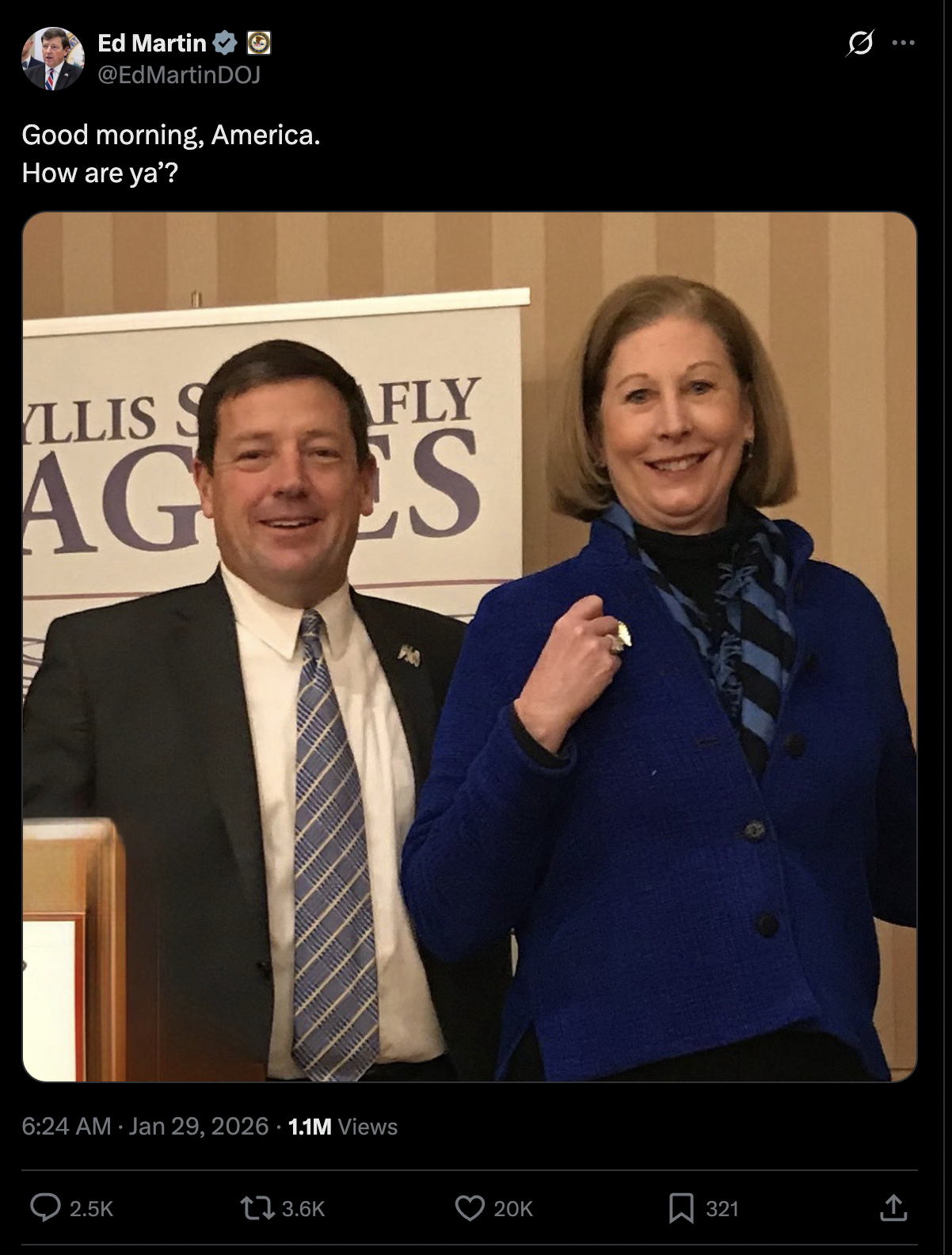 Smooth-brained Ed Martin, the January 6 sympathizer nutcase whos made 150 appearances spewing anti-American propaganda on Russian state TV, couldnt get confirmed as a US attorney by this Republican Senate, and now has a job AG Pammy Jo Karen Bondi created for him fighting the weaponization of the DOJ LOL posted this picture yesterday morning with the Kraken lawyer herself, mouthbreathing redneck Sidney Aw Shucks Bugfuck Powell, captioned Good morning, America. How are ya?