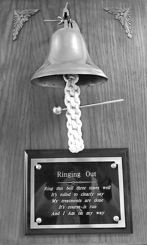A rear admiral in the U.S. Navy, Irve Le Moyne, was undergoing radiation therapy for head and neck cancer and told his doctor, Kian Ang, M.D., Ph.D., that he planned to follow a Navy tradition of ringing a bell to signify when the job was done. He brought a brass bell to his last treatment, rang it several times and left it as a donation. It was mounted on a wall plaque in the Main Buildings Radiation Treatment Center with the inscription:
